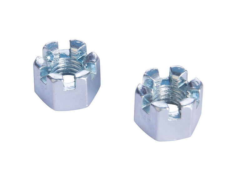 How it Works: Unlike nylon lock nuts which rely on friction, a Castle Nut provides a mechanical positive lock. Once tightened, a Cotter Pin (Split Pin) is inserted through the slots and a drilled hole in the bolt shank. This physically prevents the nut from rotating, making it immune to extreme vibration.